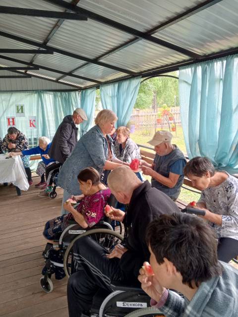 7 августа в ОГБУСО «Шебертинский дом социального обслуживания» состоялся долгожданный «День Арбуза». Ну кто откажется полакомиться сочным арбузом, да еще и в жаркий летний денек?! Культорганизатор Бархатова Татьяна Валентиновна организовала для получателей социальных услуг различные конкурсы, веселые эстафеты и игры. Звучала веселая, задорная музыка, создававшая праздничное настроение. В шатре были накрыты столы, на которых находился виновник праздника – арбуз. А для тех, кто не смог присоединиться к мероприятию на улице, арбузное угощение было организовано прямо в комнатах. В этот день абсолютно все смогли насладиться сочным и ароматным арбузом и повеселиться в теплой дружеской атмосфере. «День Арбуза» получился по-настоящему ярким и летним и все остались довольны — а это самое главное!