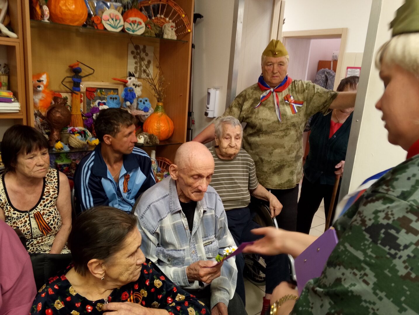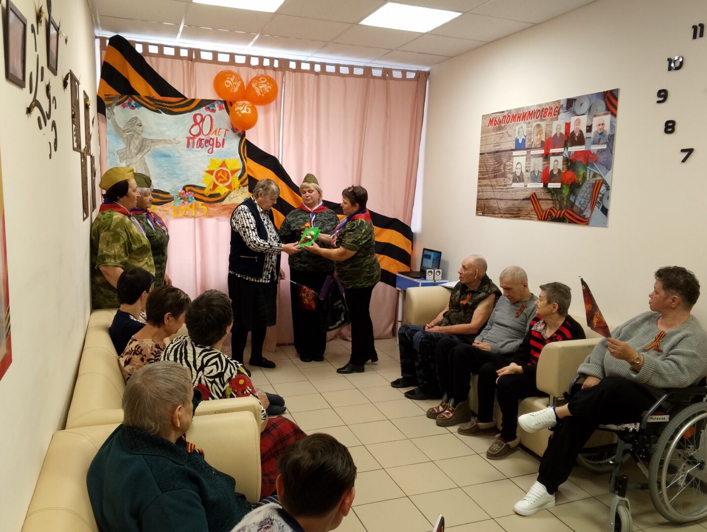 5 мая с праздничным концертом, приуроченным к 80-летней годовщине Победы в Великой Отечественной войне наше учреждение посетила вокальная группа Шебертинского дома культуры «Черемушки». Библиотекарь дома культуры Коба Алена Юрьевна подготовила для получателей социальных услуг отрывки прозаических и стихотворных произведений, от чтения которых у всех наворачивались слезы на глазах. Вокальная группа исполнила песни военных лет, которым все подпевали хором. Получатель социальных услуг Шиянова Екатерина Алексеевна (ребенок войны) прочитала стихотворение Константина Симонова «Майор». В конце мероприятия гости вручили поздравительные открытки всем присутствующим. Эти открытки с уважением и любовью изготовили дети, посещающие кружок в доме культуры. Благодарим вокальную группу «Черемушки» и заведующую Шебертинским домом культуры Косенко Ольгу Николаевну за прекрасное мероприятие и активное участие в жизни нашего учреждения. Эти замечательные люди всегда навещают наших получателей социальных услуг, даря им тепло, любовь и внимание, которые им так необходимы.