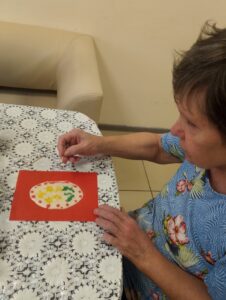 Как сделать процесс рисования увлекательным и развивающим? В ОГБУСО «Шебертинский ДСО» прошло занятие по рисованию жидким цветным соленым тестом. Данная методика способствует развитию мелкой моторики и художественных навыков получателей социальных услуг. Сначала участники занятия приготовили в стаканчиках жидкое тесто, в которое добавляли гуашь различных цветов. Для рисования кисточки не используются, а применяются ложки, стеки или зубочистки. На плотном картоне сделали заготовку своего изделия, а затем используя тесто других цветов, наносили рисунок при помощи зубочисток. Такой метод рисования не только развивает эстетические качества получателей социальных услуг, но и позволяет тренировать мелкую моторику рук. В результате занятия у каждого получились замечательные картины.