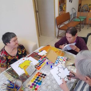 Участники мастерской раскрашивали шаблоны осенних листочков, затем вырезали их и склеивали в объемную композицию. Во время работы, все делились своими впечатлениями и воспоминаниями, обсуждали красоту русской природы. В итоге, получились замечательные работы, которые всем поднимают настроение.