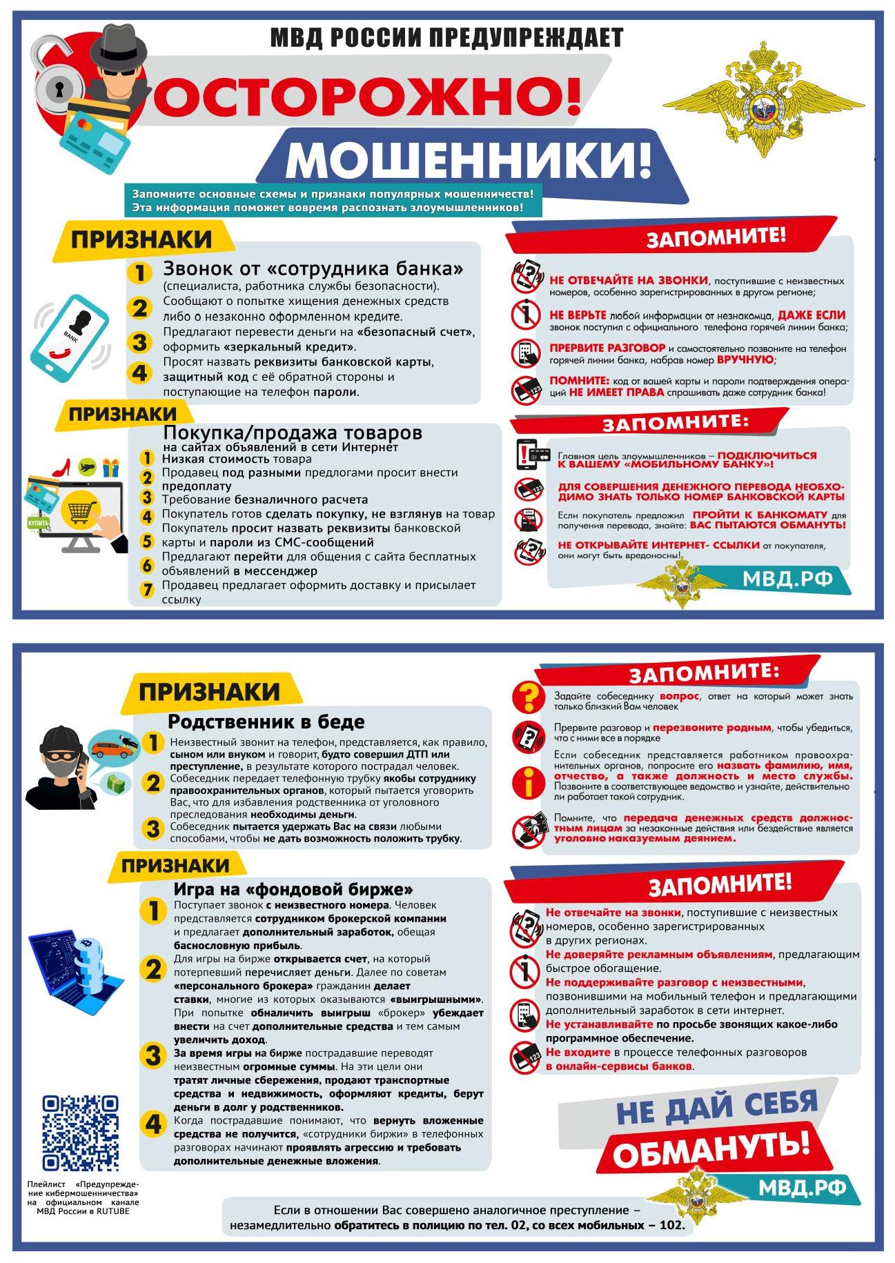 В целях профилактики хищений денежных средств граждан, совершаемых с использованием информационно-коммуникационных технологий, ознакомьтесь с информационными материалами ГУ МВД России.