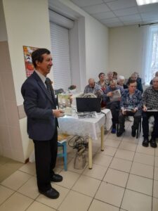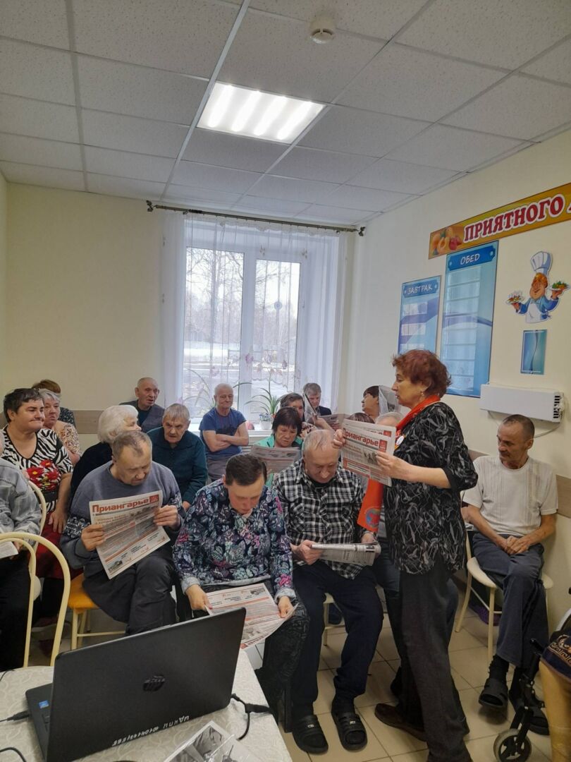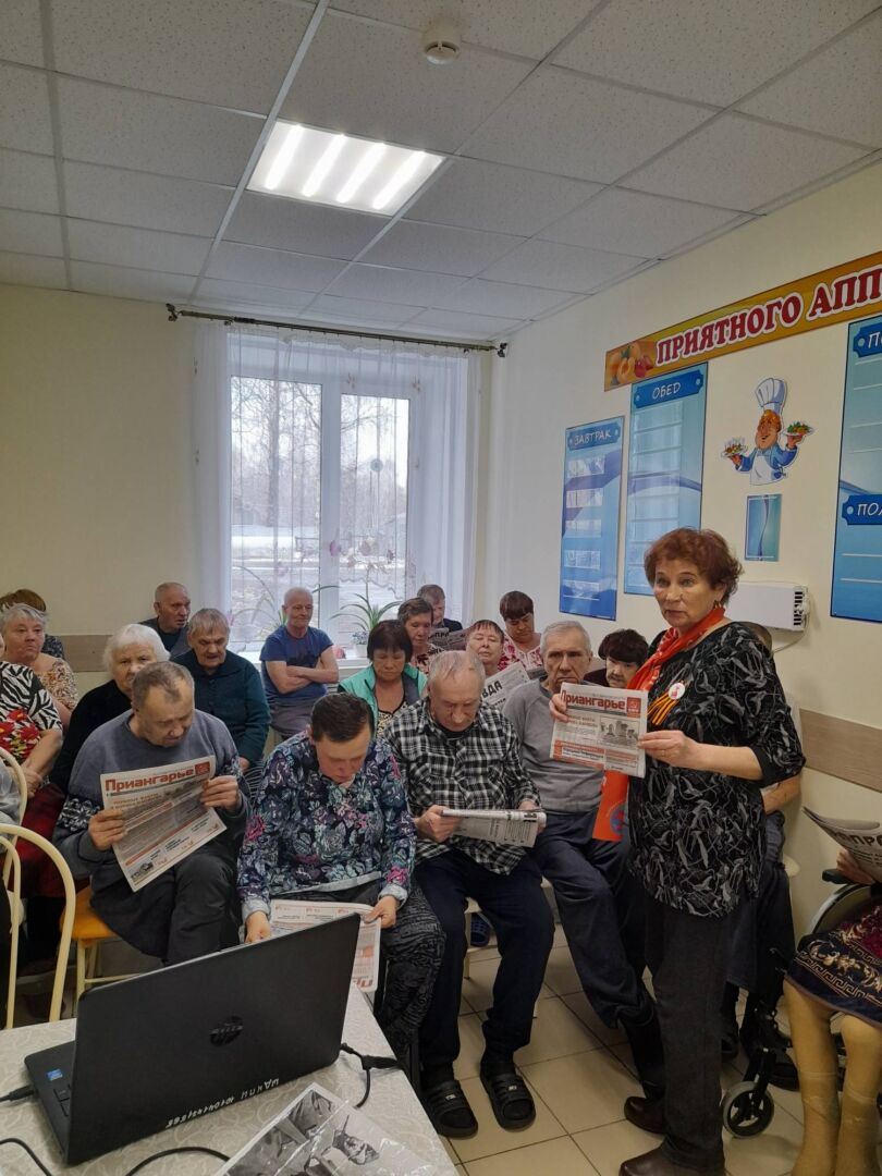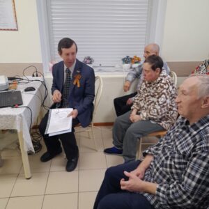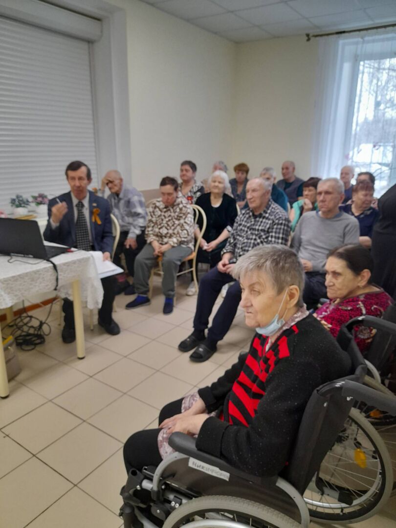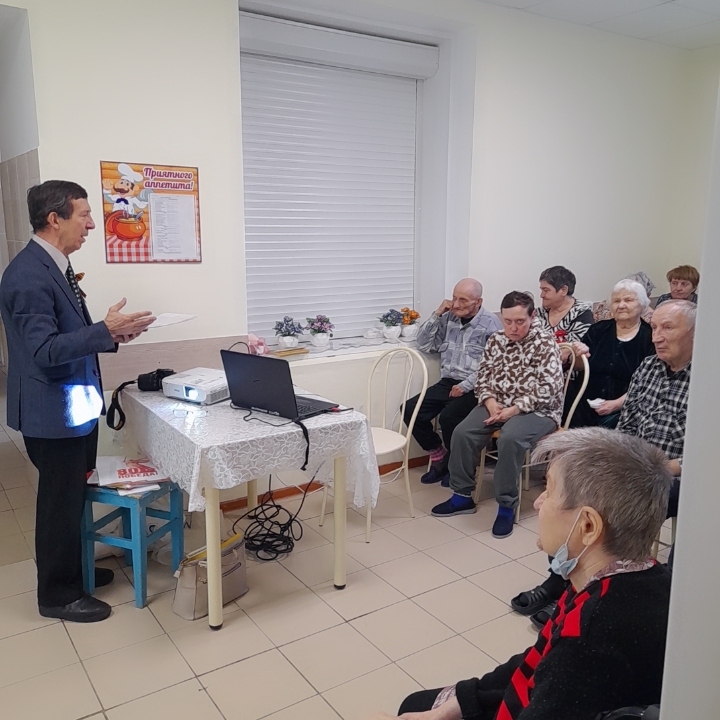 В рамках празднования 80-летия Победы в Великой Отечественной войне 9 апреля в ОГБУСО «Шебертинский дом социального обслуживания» состоялась встреча с представителями Нижнеудинского отделения организации «Ветераны комсомола». Председатель отделения Якименко Сергей Ефимович рассказал получателям социальных услуг о великих полководцах, ковавших Победу наших воинов в борьбе с фашистскими захватчиками. Жук Татьяна Андреевна и Зеленина Валентина Романовна подарили слушателям газеты «Приангарье» и «Правда», поздравительные открытки с 9 мая в советском стиле. А также Сергей Ефимович подарил учреждению книгу «Главные уроки ее жизни», посвященную памяти заслуженного учителя школы РСФСР, почетном гражданине Нижнеудинского района Алимпиаде Ефимовне Павлюченко.