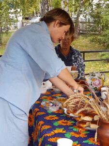 29 августа получатели социальных услуг ОГБУСО «Шебертинский дом социального обслуживания» праздновали яблочный, хлебный и медовый спасы. Руководитель кружка Плешанова Анна Александровна познакомила присутствующих с историей и традициями проведения праздника. Для участников праздника был накрыт праздничный стол на котором присутствовали главные атрибуты праздника – хлеб, яблоки, мед, орехи, а также другие лакомства. Повар нашего учреждения Никонович Светлана Михайловна испекла к празднику свежий, душистый, ароматный хлеб и булочки.