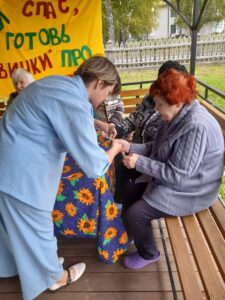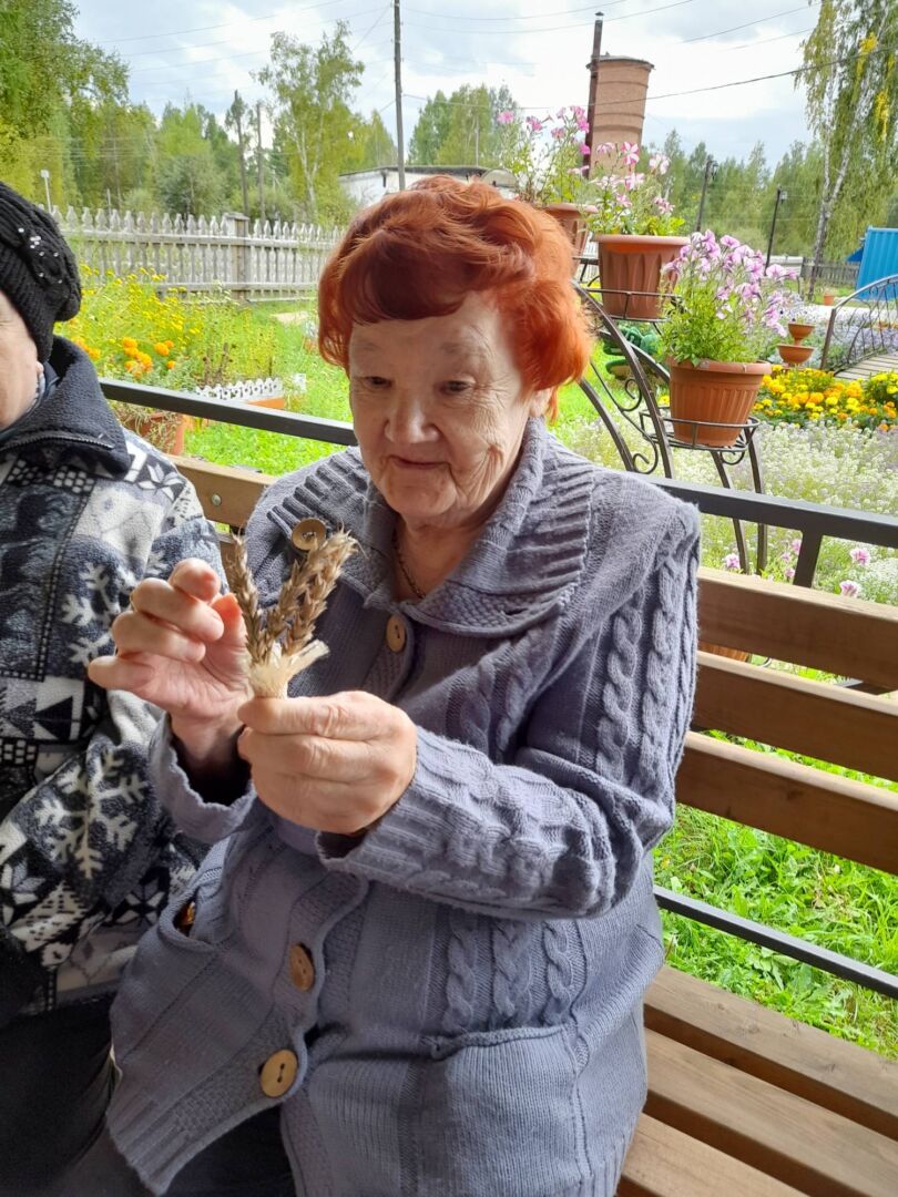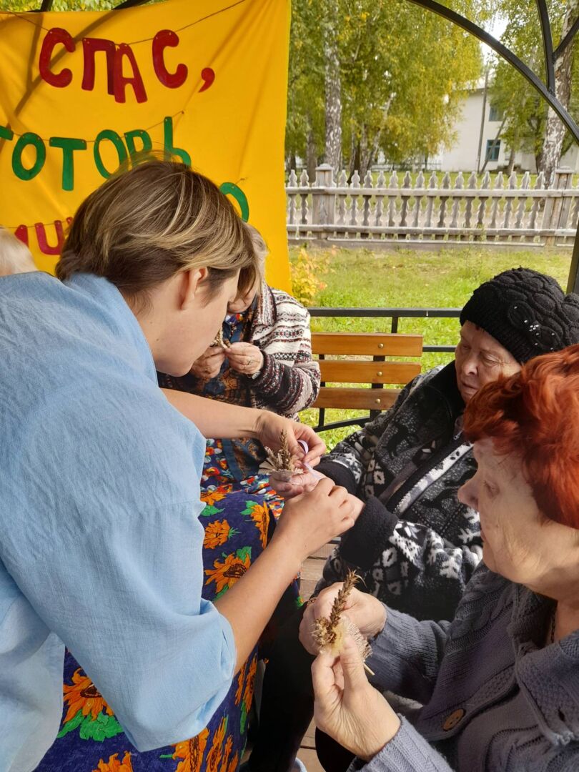 После чаепития Анна Александровна провела с получателями социальных услуг мастер-класс по изготовлению оберега, который приносит здоровье и долголетие. Из рогожи, колосков и ленточек все желающие изготовили себе оберег.